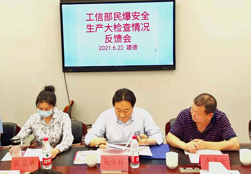 为加强安全生产,强化企业主体责任落实,以良好的安全环境迎接建党100周年,6月22日,工信部安全生产司民爆处处长鲍常科、二级巡视员肖月华及专家组一行到我司下属京安科技公司开展“双随机一公开”执法检查。省委军民融合办副主任卢飞云、安全监管处处长周超,杭州市委军民融合办二级巡视员段长林,建德市副市长、公安局长王伟及建德市相关职能部门负责人陪同检查。新联公司总经理马福民、安全技术部经理刘忠,京安爆破公司执行董事陈晓红、副总经理辛振坤、汪兴国一同参加检查。