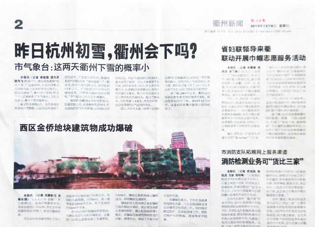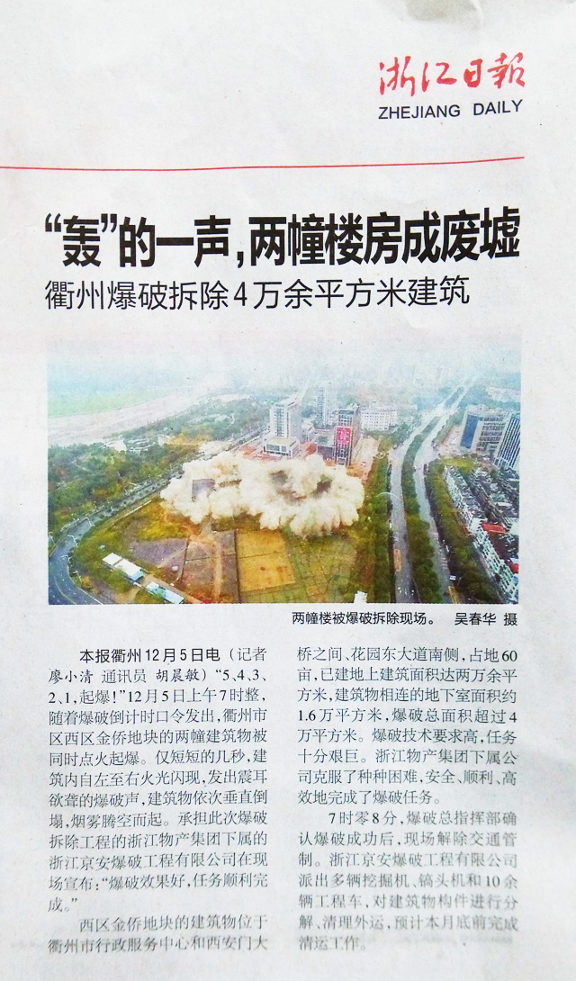 “5、4、3、2、1,起爆!”12月5日上午7时整,随着爆破倒计时口令发出,衢州市区西区金侨地块的两幢建筑物被同时点火起爆。仅短短的几秒,建筑内自南至北火光闪现,发出一阵阵连续清脆的爆破声,建筑物依次垂直倒塌,烟雾腾空而起。承担此次爆破拆除工程的浙江物产集团下属的ky在线在现场宣布:“爆破效果良好,任务顺利完成!”